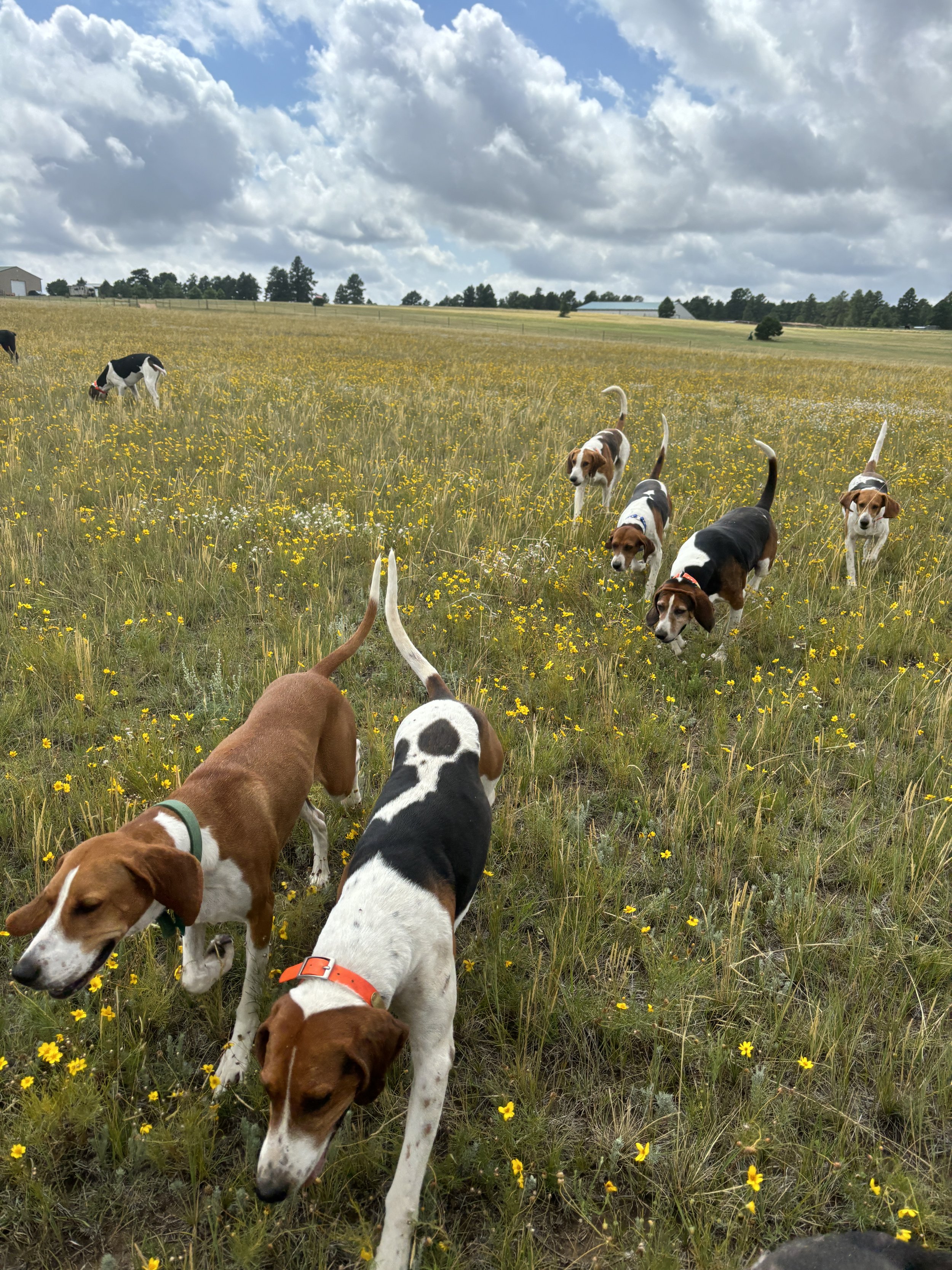 Beasy holds a special place in the heart of Comanche Creek Hounds—she’s the OG, the first hound in the pack, and the one who started it all. She came to us from the huntsman’s former hunt with a few medical issues that needed attention, which led to her surrender. With care, time, and love, Beasy healed—and what emerged is a spry, spunky, and seriously fast hound who hasn’t looked back.